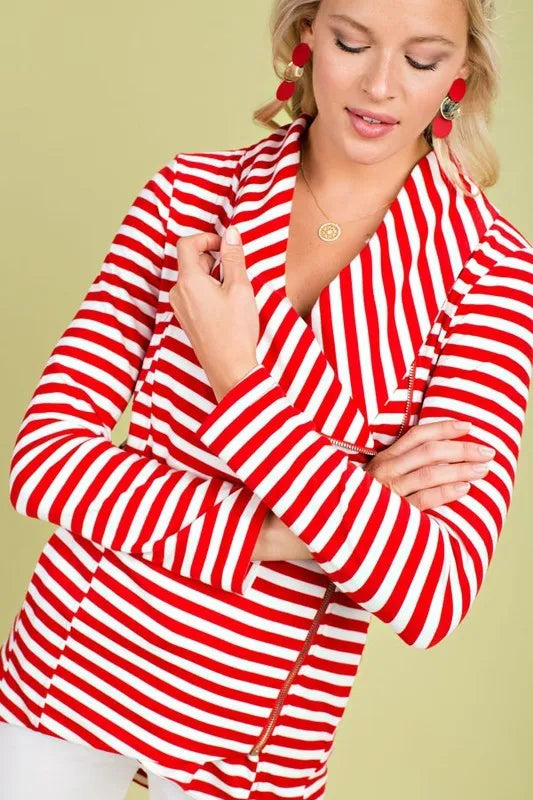 Es una prenda versátil y llamativa, con cierre delantero tipo cremallera y mangas largas. Su diseño de rayas horizontales y cuello envolvente le da un aire moderno y sofisticado, manteniendo a la vez un estilo casual chic.