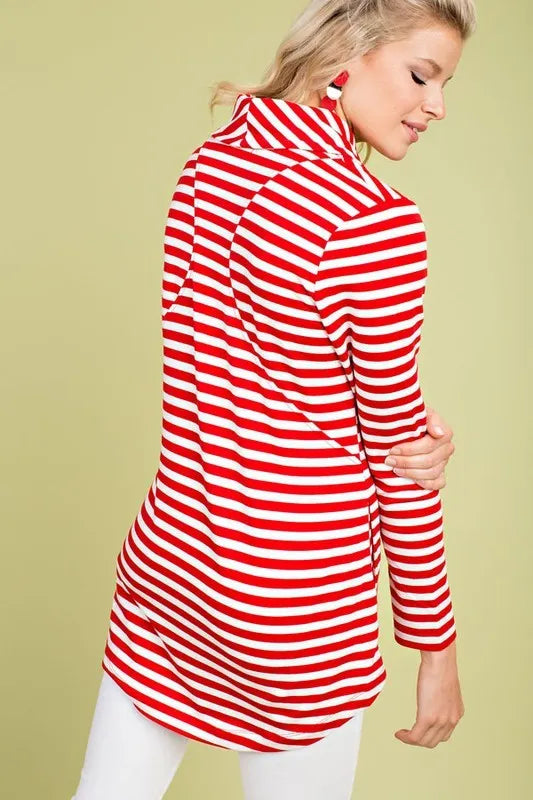 Modelo con cuello owl (o cuello envolvente) y estampado de rayas rojas y blancas.