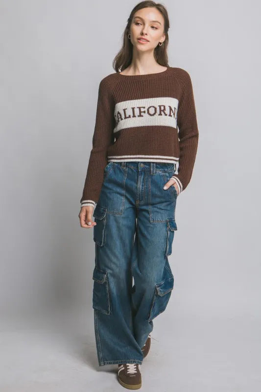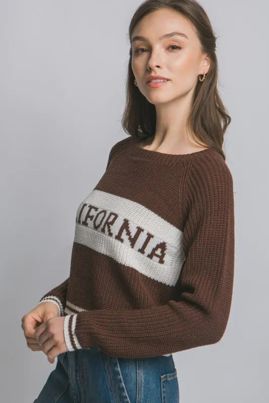 Chaleco tejido de manga larga, con una franja horizontal blanca en el pecho que lleva el escrito "CALIFORNIA" en letras café. Tiene un diseño cómodo, juvenil y urbano, con corte recto y un estilo casual relajado.